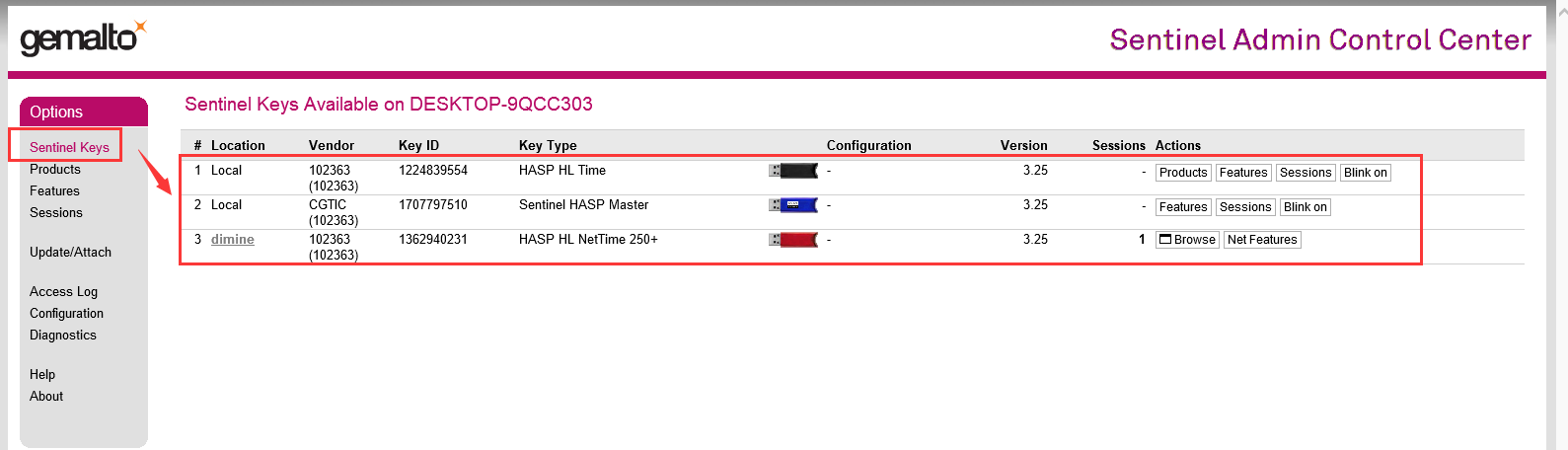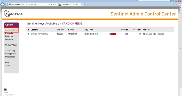 (4)完成上述設(shè)置后,在Sentinel Keys項中可查看硬件加密鎖連接信息,如下圖所示: