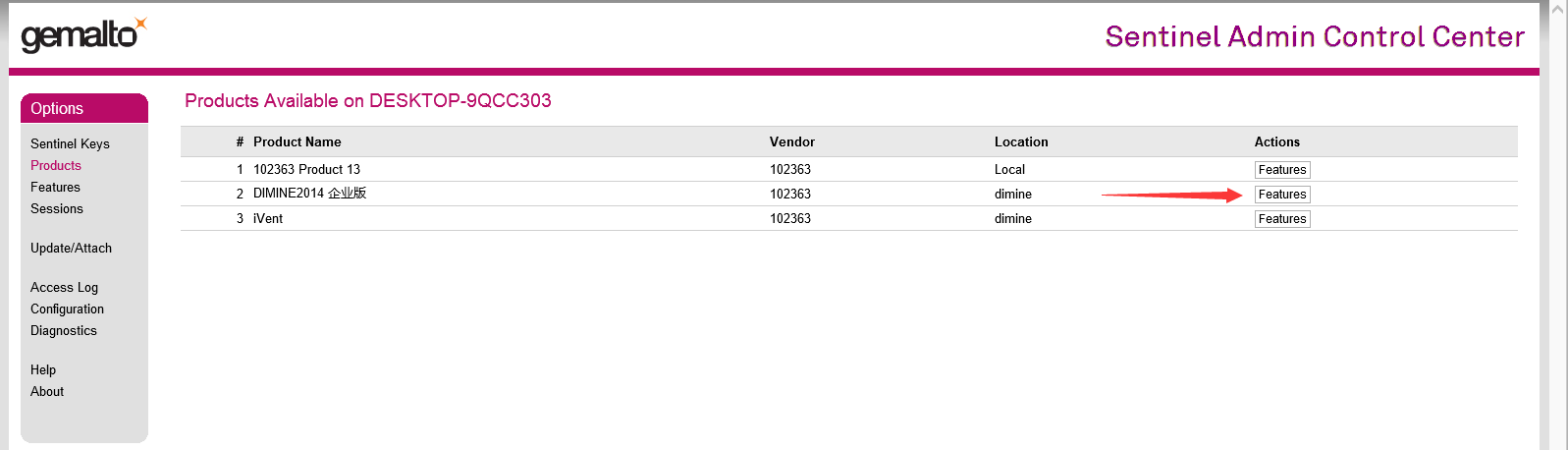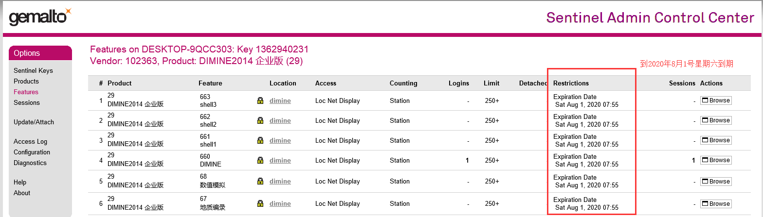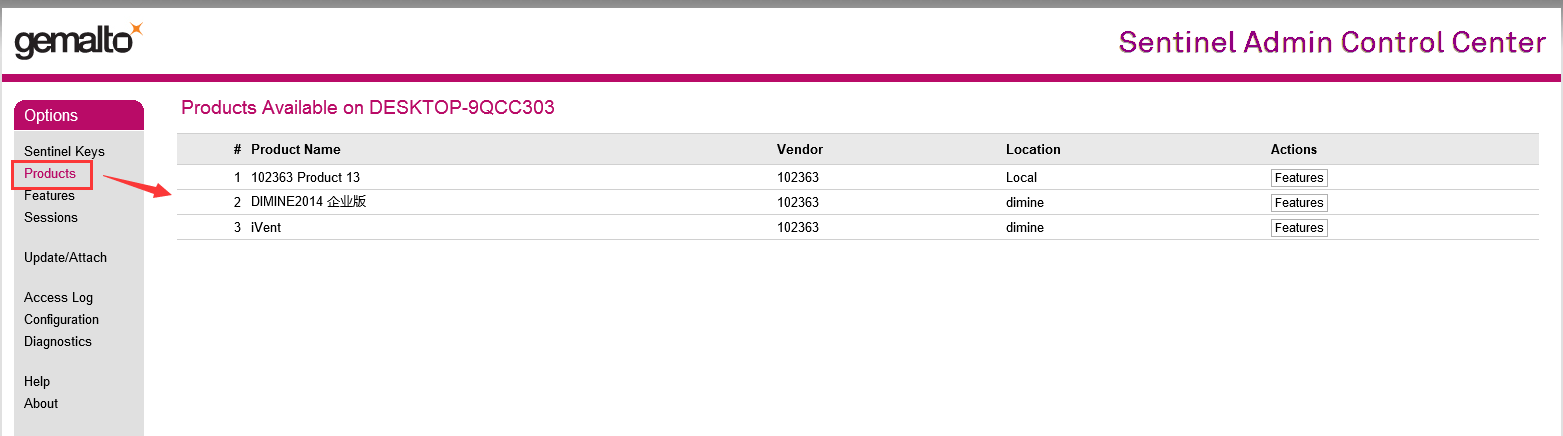 4、點擊相應(yīng)產(chǎn)品后面的features,查看對應(yīng)加密鎖有效期